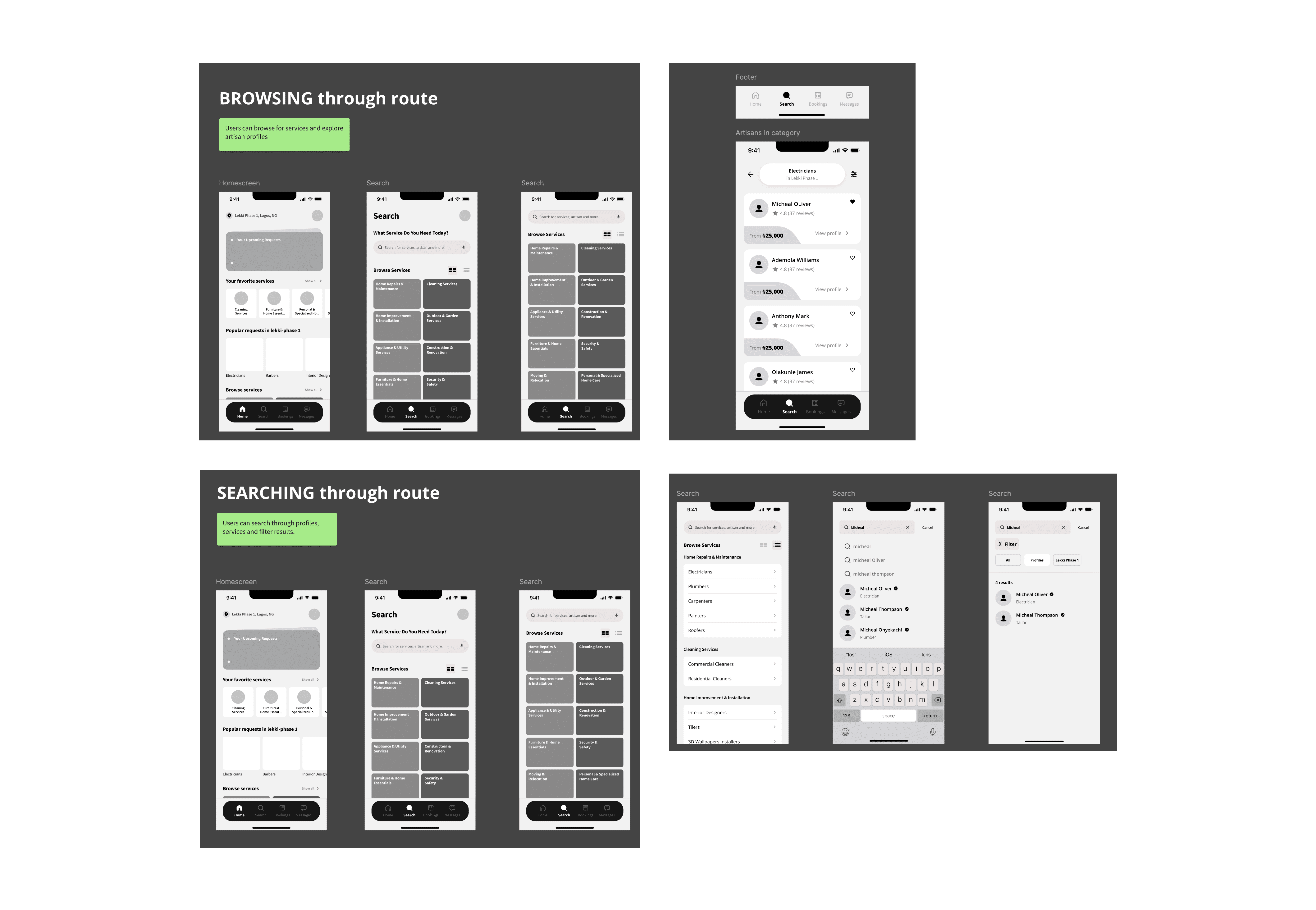 The first thing I did was to go on a discovery journey to clearly understand the problem, audience, and the features to be designed for the app. I identified certain technological constraints for building the product, from the platform it could be built on to how the data (data such as artisan information, services, location and more) would be presented. This is to give better clarity on what sorts of APIs that would be needed to implement such an app, and whether it was even feasible in the first place. I also studied similar apps, and identified several user specific needs, such as: The need for an artisan profile to clearly show reviews and ratings, a place to find artisan based on location and booking a slot. And lastly, I proceeded to creating user flows, wireframes which were then translated into final design.