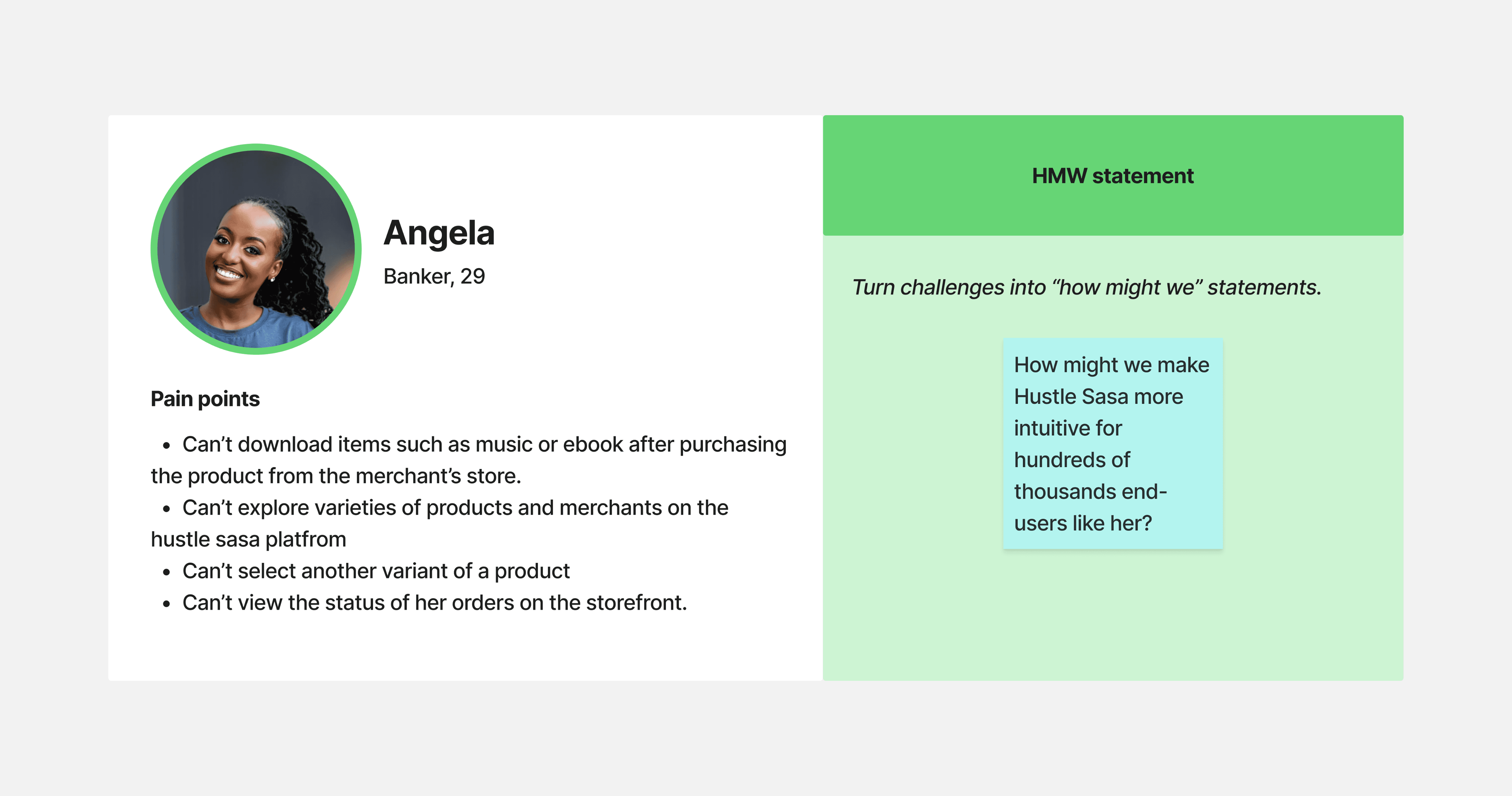 Meet our end user Angela; she is tech savvy, enjoys listening to music, attending concerts and events, and buying merchandise. She needs an app that provides solution to her needs. How might we make Hustle Sasa more intuitive for hundreds of thousands end-users like her?