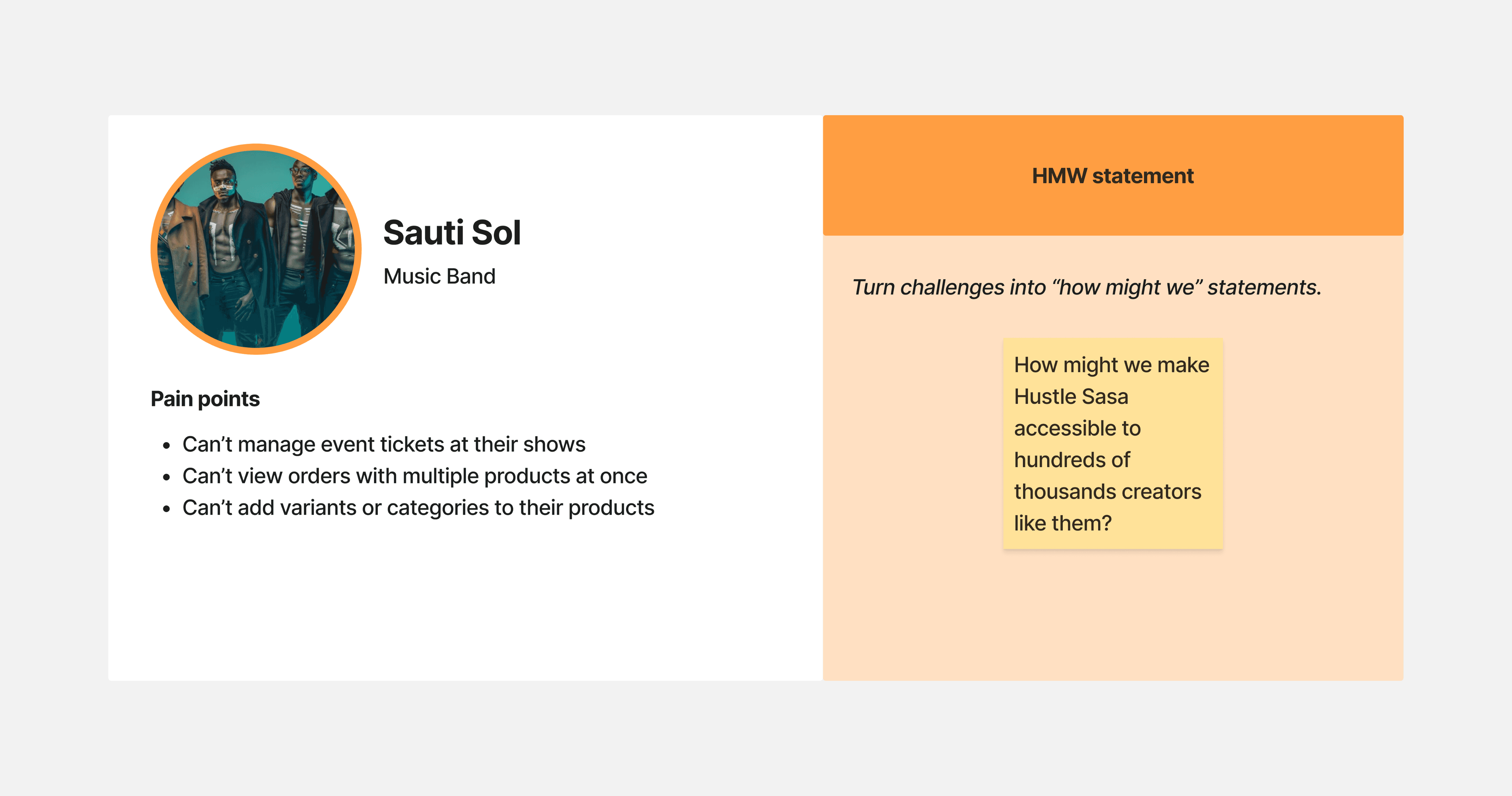 Meet our user - Sauti Sol, a Kenya based music band that's tech savvy, enjoys making music, organizing and managing events and creating merchandise for their audience in Nairobi. They need an all-in-one app that enables them to sell their products and services to their audience. How might we make Hustle Sasa accessible to hundreds of thousands creators like them?